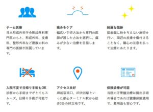 - 臨床実績(2024年時点) 皮膚腫瘍・皮膚外科手術:30,000件以上、腋臭症治療:2,000件以上、酒さ・赤ら顔治療:1,000件以上