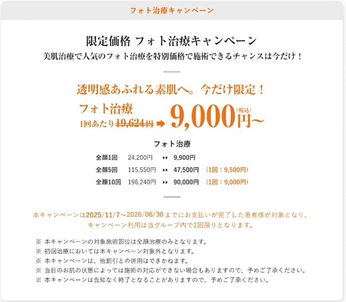 アイシークリニックのフォト治療(ICON)料金メニュー