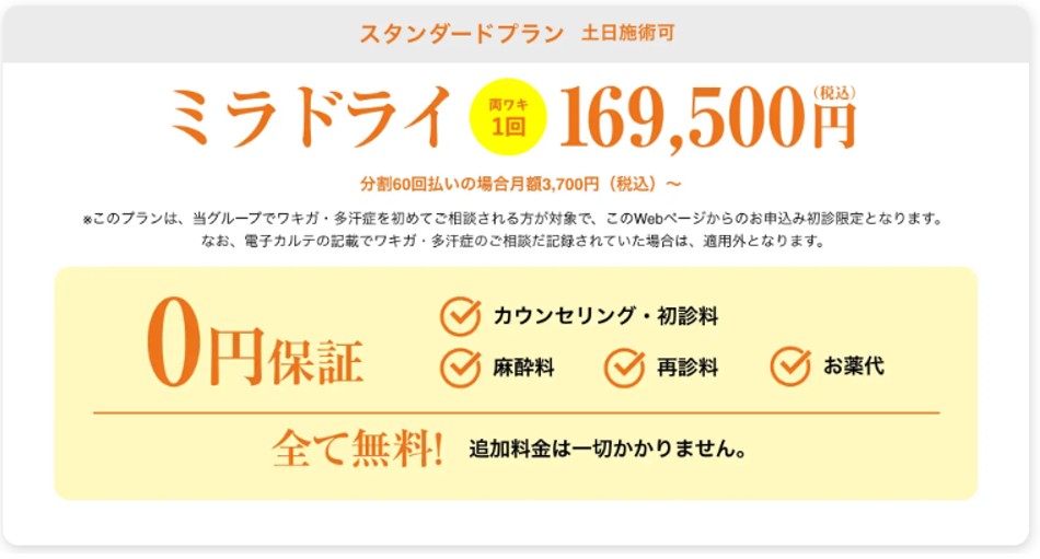 当院でのワキガ・ワキ多汗症治療の詳しい料金はワキガ・ワキ多汗症の料金表をご覧ください。